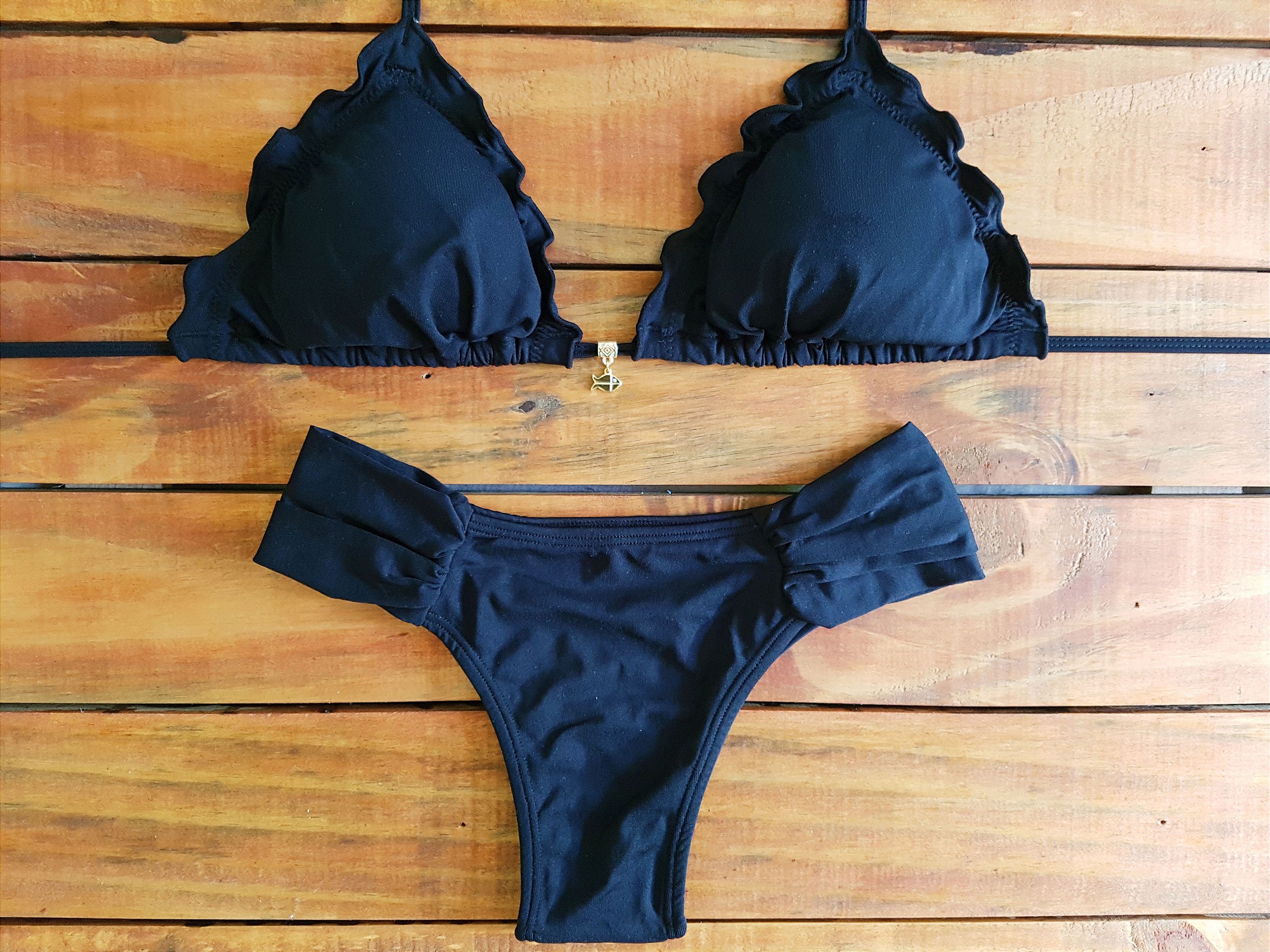 Biquíni Borboleta Preto: top cortininha que ajuda a regular da melhor forma no seu corpo, possui bojo removivel, Calcinha com Lateral Drapeada Preta super confortável no modelo tradicional.