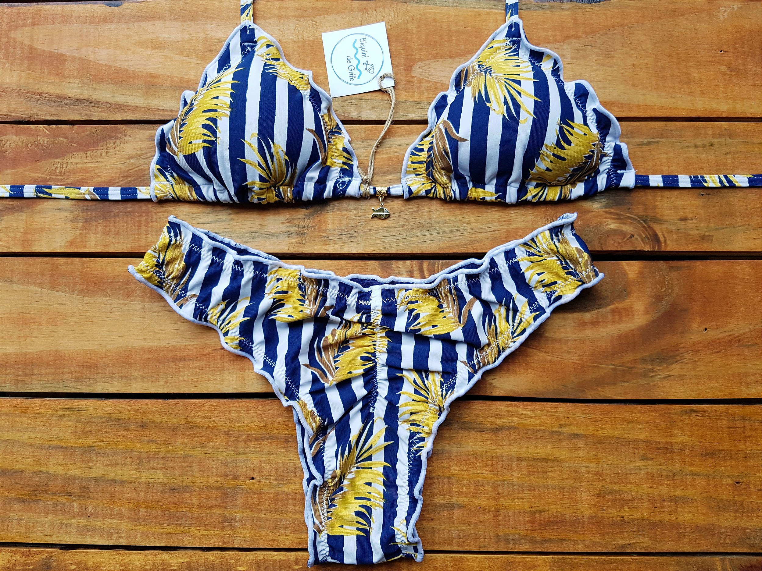 Biquíni Ripple Fixo - Coqueiro Listra Azul: top cortininha que ajuda a regular da melhor forma no seu corpo, possui bojo removivel, calcinha super confortável no modelo tradicional, com frufru nas laterais e empina bumbum atrás .